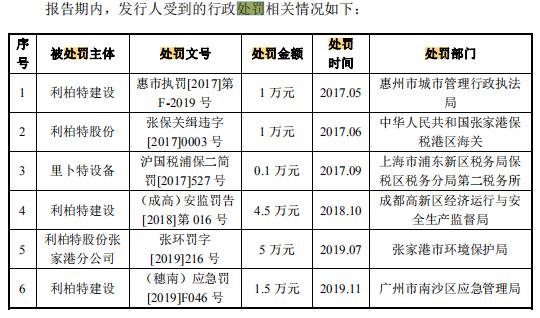 利柏特建设因所承接的普莱克斯(惠州)工业气体有限公司项目未取得批准擅自施工,惠州市城市管理行政执法局于2017年5月26日出具了惠市执罚[2017]第F-2019号《行政处罚通知书》,依据《中华人民共和国建筑法》第七条、《建设工程施工许可管理办法》第十二条对利柏特建设处以1万元的行政处罚。