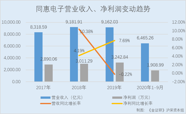 据公开说明书,2017-2019年及2020年1-9月,同惠电子的营业收入分别为8,318.59万元、9,181.91万元、9,162.03万元、6,465.26万元,2018-2019年分别同比增长10.38、-0.22%。