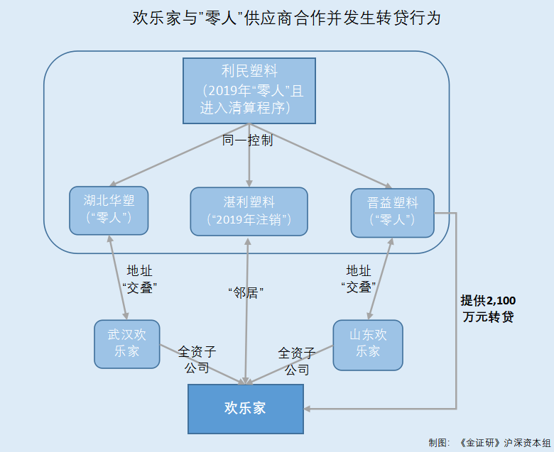 也就是说,利民塑料控制的湖北华塑、晋益塑料或为“零人”公司,并分别与欢乐家的子公司共用地址、互为“邻居”,异象“迭出”拷问交易的真实性。且欢乐家通过或为“零人”公司的晋益塑料发生的2,100万元的转贷行为,其中是否具备真实交易背景?或也要打上一个“问号”。