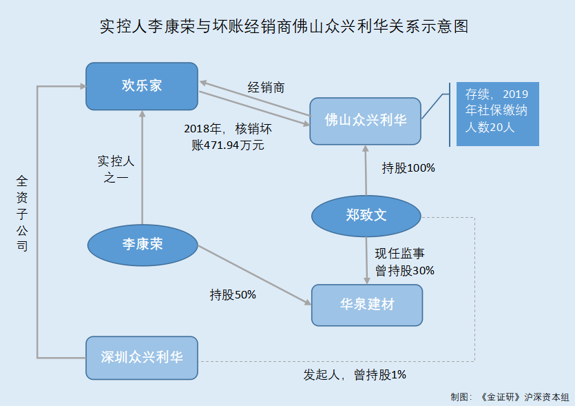 据招股书,李康荣系欢乐家实际控制人之一。湛江华泉建材有限公司(以下简称“华泉建材”)系李康荣控制的其他企业,为欢乐家的关联方。华泉建材成立于2013年3月27日,主营业务为建筑材料的生产和销售,李康荣对华泉建材持股50%,郑真华持股50%。