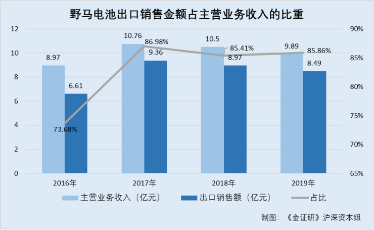 据招股书及2019年招股书,2016-2019年,野马电池的主营业务收入分别为8.97亿元、10.76亿元、10.5亿元、9.89亿元,同期出口销售额分别为6.61亿元、9.36亿元、8.97亿元、8.49亿元,占当期主营业务收入的比重分别为73.68%、86.98%、85.41%、85.86%。