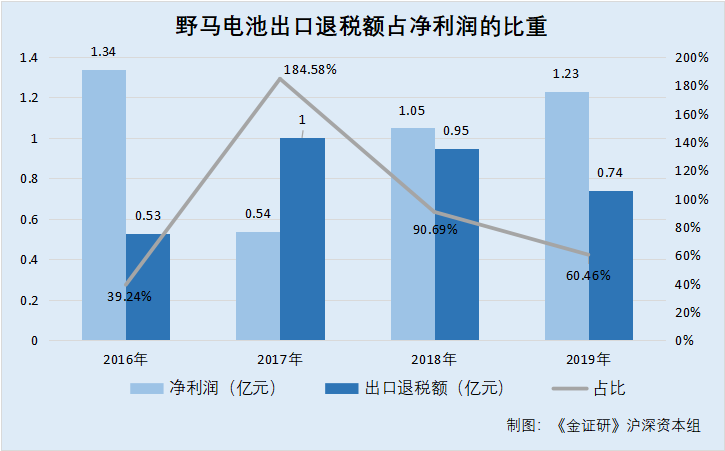 据招股书、2019年招股书,2016-2019年,野马电池享受的出口退税金额分别为0.53亿元、1亿元、0.95亿元、0.74亿元,占当期净利润的比重分别为39.24%、184.58%、90.69%、60.46%。