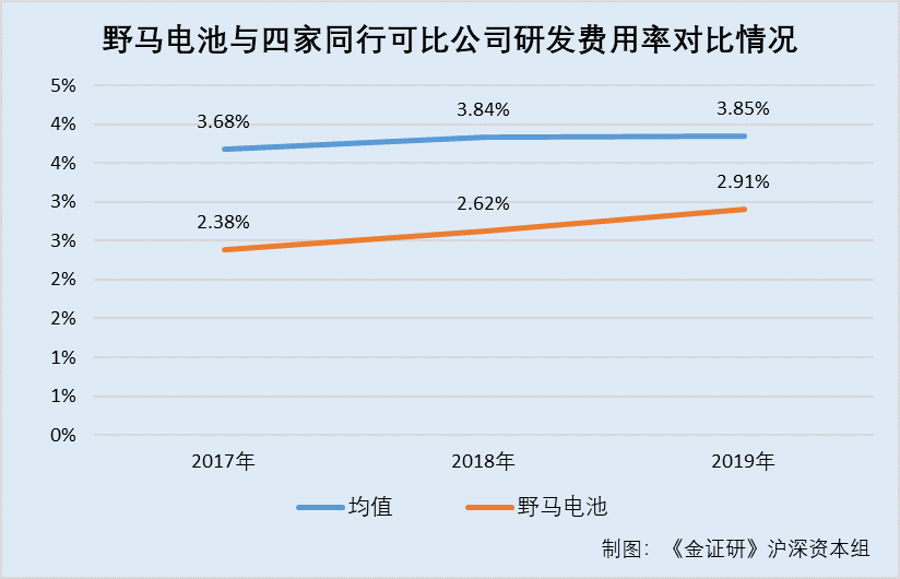2017-2019年,上述4家同行业可比公司的研发费用率均值分别为3.68%、3.84%、3.85%。可见,野马电池研发费用率不及同行平均水平。