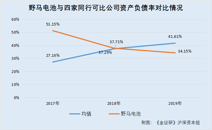 同期,上述同行业可比公司资产负债率均值分别为27.16%、37.29%、41.61%,逐年走高。2019年,野马电池资产负债率低于同行均值。