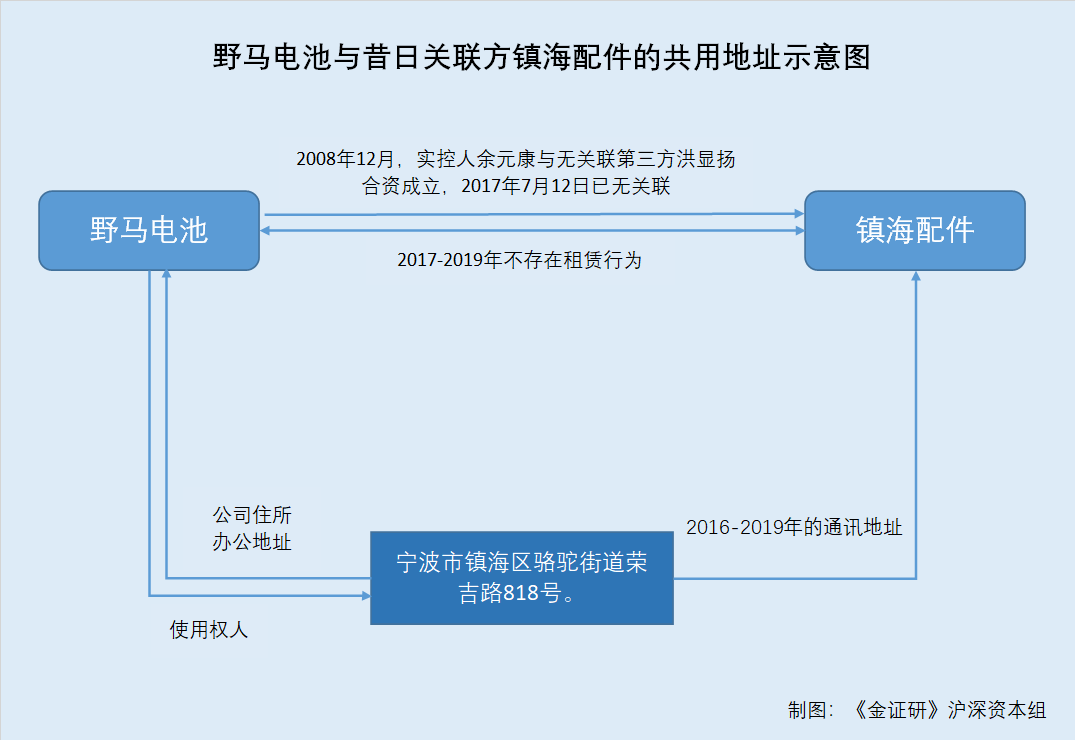也就是说,2016-2017年,镇海配件作为关联方,曾与野马电池或共用企业通讯地址。而2018-2019年,镇海配件虽已不是野马电池的关联方,但其通讯地址并未发生改变,仍处于与野马电池共用状态。