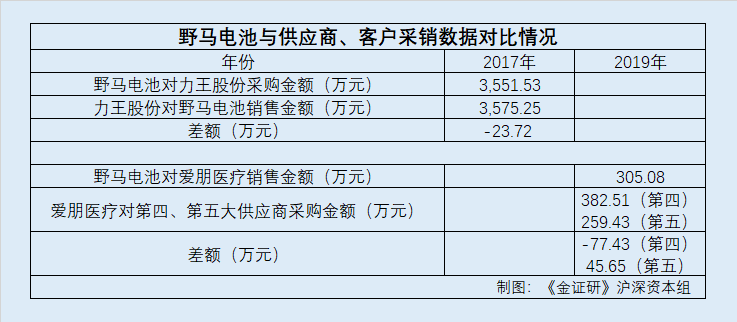 据爱朋医疗2019年报,2019年,爱朋医疗向第四、第五大供应商的采购金额分别为382.51万元、259.43万元。即是说,2019年,野马电池对爱朋医疗的销售额,比爱朋医疗对披露的其对第五大供应商采购额还多,即野马电池披露的销售数据与爱朋医疗披露的采购金额“对不上”。