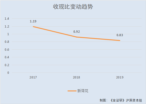 据招股书,新荷花经营活动现金流入小计分别为27,869.57万元、28,476.99万元、30,284.98万元。即同期,新荷花的收现比分别为1.19、0.92、0.83。