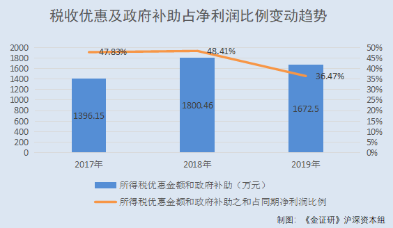 经《金证研》沪深资本组测算,2017-2019年,新荷花的所得税优惠金额和政府补助合计分别为1,396.15万元、1,800.46万元、1,672.5万元,占同期净利润的比例分别为47.83%、48.41%、36.47%。