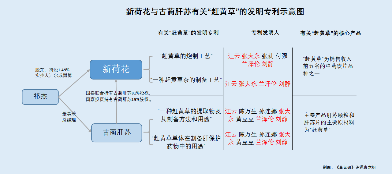 需要注意的是,新荷花也拥有与“赶黄草”相关的发明专利,且发明人与古蔺肝苏发明专利的发明人存在“重叠”。