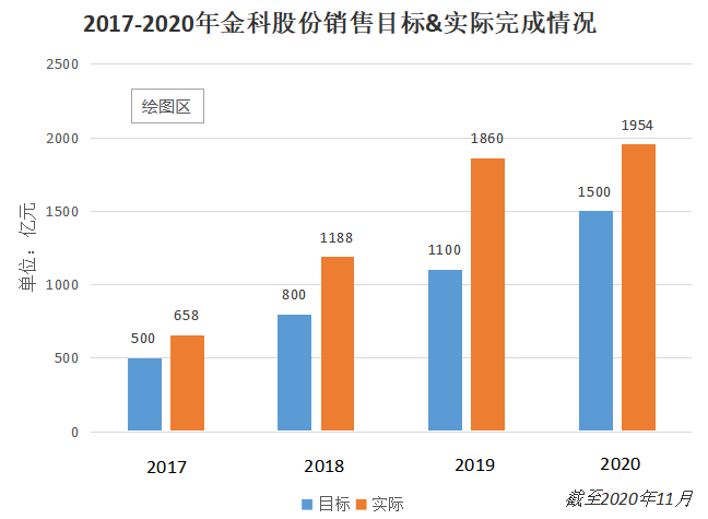 2017年6月,徐翔案判决结果半年,对金科股份的影响逐渐消退后,金科股份提出《2017-2020年发展战略规划》,公布这四年销售目标分别为500亿元、800亿元、1100亿元、1500亿元,尽量在2020年冲击2000亿元。