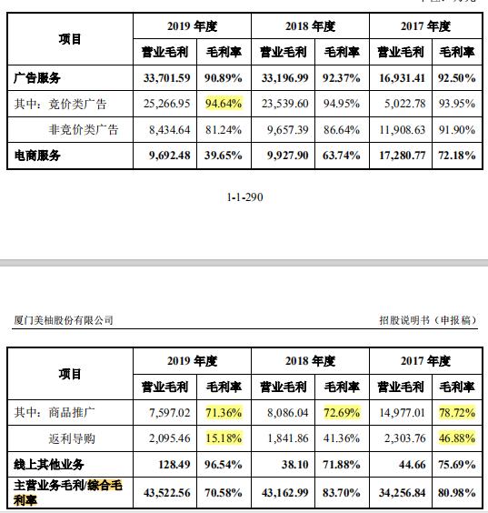权衡财经Iqhcj还注意到电商服务类业务的变动,或给美柚股份带来更大的盈利压力。在电商服务业务中,美柚股份主要通过淘宝、天猫、京东、拼多多等大型电商平台的推广联盟来开展商品推广和返利导购服务,按实际完成交易金额的一定比例获取电商导购佣金收入。2017—2019年,美柚股份电商服务中的商品推广收入分别为1.9亿元、1.11亿元和1.06亿元,占电商服务收入比例由2017年的44.97%下降到了2019年的17.27%,2018年和2019年的同比增长率分别为-41.54%及-4.29%,均为负增长;尤其是2018 年度,其商品推广服务收入下降幅度较大,对此美柚股份称美柚股份商品推广服务选取的商品以低单价、高周转的商品为主,以下沉市场为主。