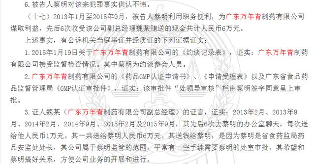 文书显示,2013年1月至2015年9月,被告人蔡明利用职务便利,为广东万年青制药有限公司谋取利益,先后6次收受该公司副总经理魏某贿送的现金共计人民币6万元。根据证人魏某(广东万年青制药有限公司副总经理)的证言,证实:2013年2月、2013年9月、2014年2月、2014年9月、2015年2月及2015年9月,其先后6次去蔡明的办公室聊天,每次送给他人民币1万元;其一共送给蔡明人民币6万元,送钱给蔡明,是因为蔡明是广东省食药监局药品安监处处长,其公司属于蔡明监管的范围,平常有一些手续需要蔡明的处室审批,其希望和蔡明搞好关系,方便公司业务的开展和进行。