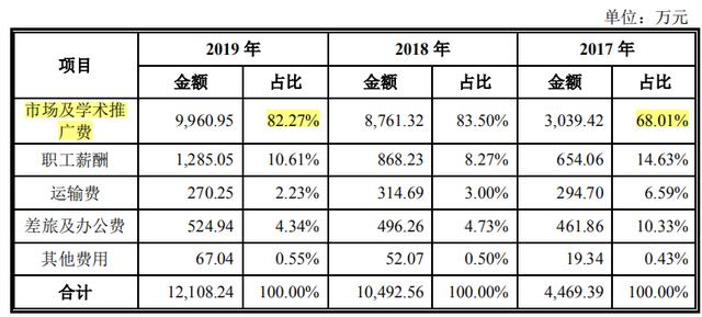 权衡财经iqhcj注意到,万年青股份2017年-2019年的销售费用分别为0.45亿元、1.05亿元和1.21亿元,分别占营业收入比例为23.33%、36.12%和38.25%。其中市场及学术推广费增幅较大,对此万年青股份称主要系公司专业化推广模式销售金额不断上升,专业化推广模式下,公司需承担产品的推广宣传费。从员工构成上,万年青股份的销售人员多达159人,占总员工人数的34.12%,仅次于生产人员的36.27%。