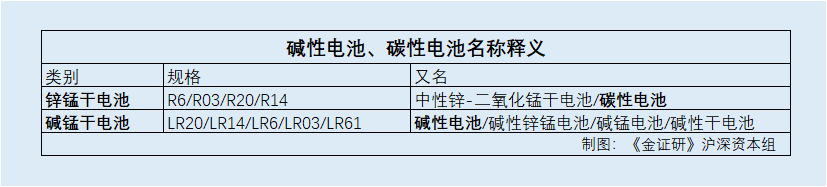 据招股书,碳性电池又称碳性锌锰电池、普通锌锰电池或碳锌电池,碱性电池又称为碱性锌锰电池、碱锰电池。也就是说,锌锰干电池即是招股书列示的碳性电池;碱锰干电池即是招股书列示的碱性电池。