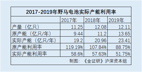那么,在产量不变的情况下,2017-2019年,野马电池的产能利用率或应分别为58.6%、57.63%、51.75%。