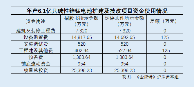 《金证研》沪深资本组通过对比发现,招股书中,“年产6.1亿只碱性锌锰电池扩建及技改项目”的资金使用,与环评报告存在“出入”。