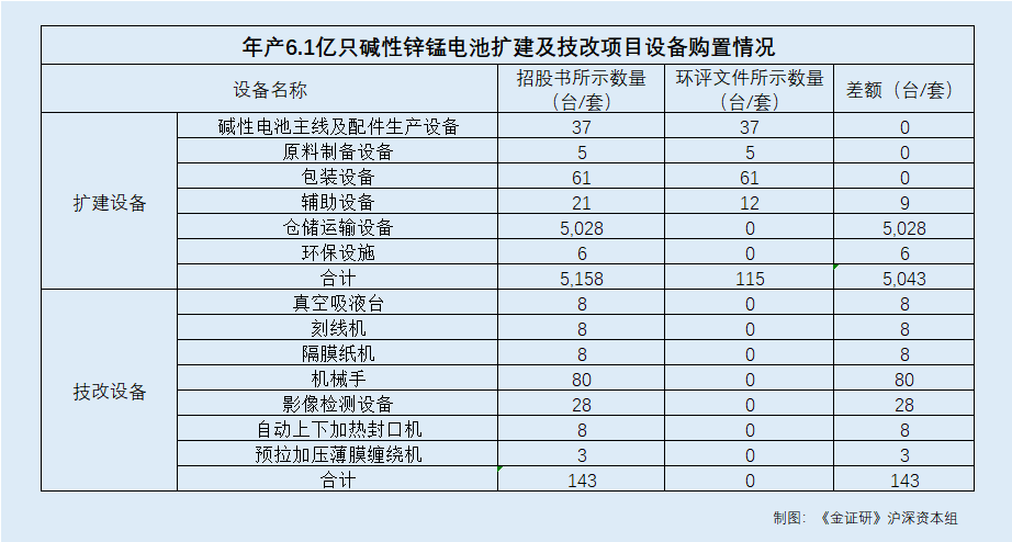 据招股书,“年产6.1亿只碱性锌锰电池扩建及技改项目”的扩建设备包括碱性电池主线及配件生产设备37台/套、原料制备设备5台/套、包装设备61台/套、辅助设备21台/套、仓储运输设备5,028台/套、环保设施6台/套,共5,158台/套。