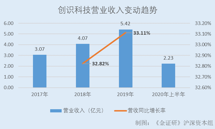 据招股书,2017-2019年及2020年上半年,创识科技的营业收入分别为3.07亿元、4.07亿元、5.42亿元、2.23亿元,2018-2019年分别同比增长32.82%、33.11%。