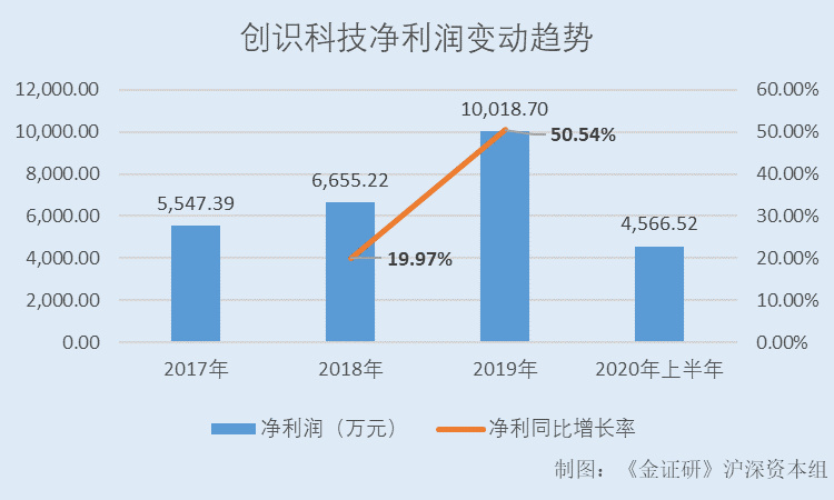 同期,创识科技的净利润分别为5,547.39万元、6,655.22万元、10,018.7万元、4,566.52万元,2018-2019年分别同比增长19.97%、50.54%。