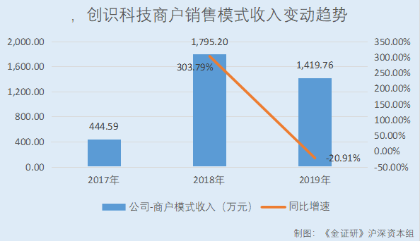 而据招股书,2017-2019年,创识科技商户销售模式的收入分别为444.59万元、1,795.2万元、1,419.76万元,2018-2019年分别同比增长303.79%、-20.91%。