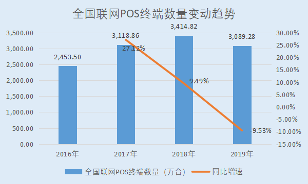 而据招股书整理的历年《中国人民银行:支付体系运行总体情况》,2016-2019年,全国联网POS终端数量分别为2,453.5万台、3,118.86万台、3,414.82万台、3,089.28万台,2017-2019年分别同比增长27%、9%、-10%。