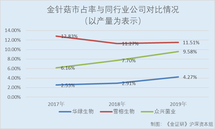也就是说,2017-2019年,华绿生物金针菇的市占率或“不敌”同行业可比公司雪榕生物、众兴菌业。