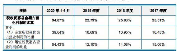 值得注意的是2017-2019 年,税收优惠总金额占发行人营业利润的比重分别为25.51%、25.03和22.79%,2020年1-6月税收优惠总金额占营业利润的比重为94.07%。