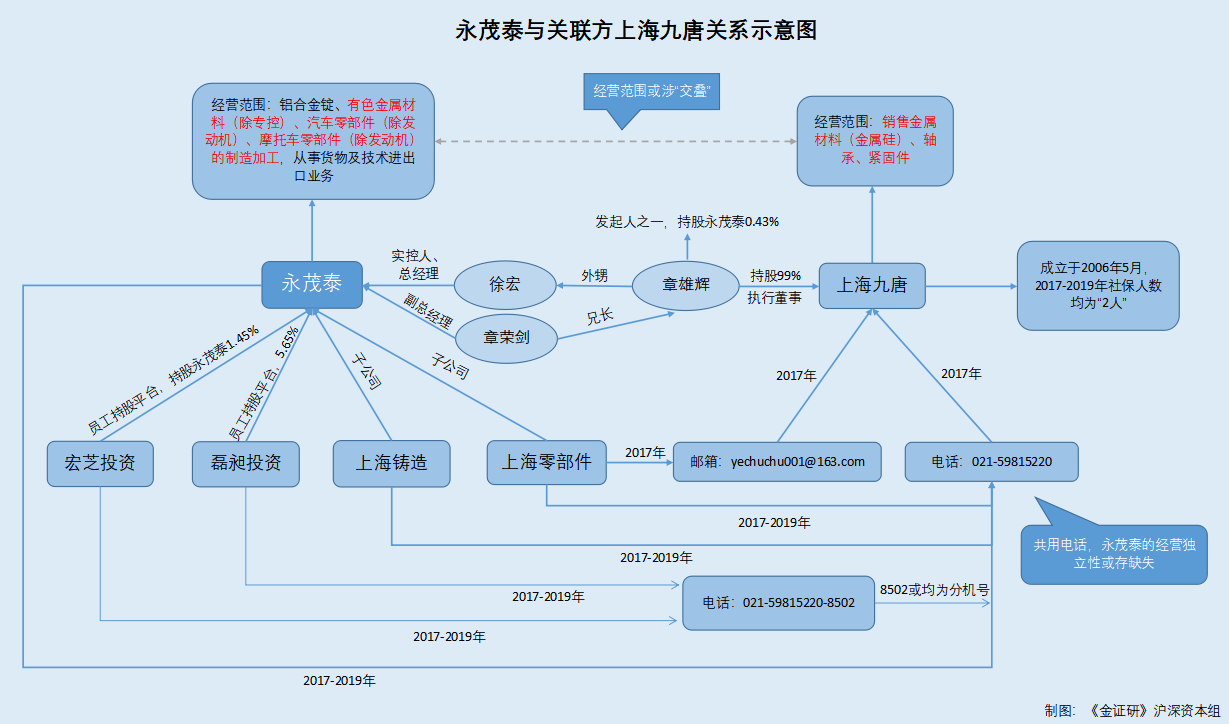 据招股书,永茂泰表示,上海九唐主要从事硅贸易,鉴于硅同时是永茂泰采购的用于生产铝合金的原材料之一,永茂泰与上海九唐存在上下游关系。但永茂泰称,其与上海九唐在报告期内未发生交易,亦不存在通过其他供应商间接向上海九唐进行采购的情况。