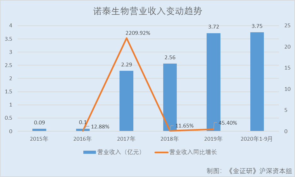 据东方财富Choice公开数据,2015-2019年,诺泰生物营业收入分别为0.09亿元、0.1亿元、2.29亿元、2.56亿元、3.72亿元,2016-2019年分别同比增长12.88%、2,209.92%、11.65%、45.4%。2020年1-9月,诺泰生物实现营业收入3.75亿元,同比增长38.09%。