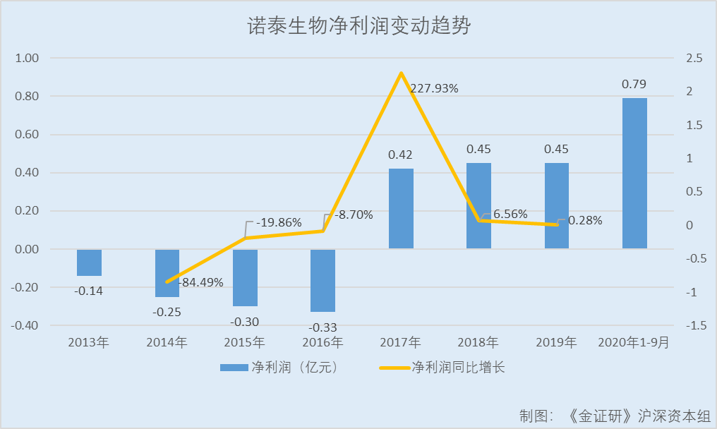 2013-2019年,诺泰生物净利润分别为-1,363.59万元、-2,515.71万元、-3,015.4万元、-3,277.61万元、4,192.93万元、4,468.12万元、4,480.59万元,2014-2019年分别同比增长-84.49%、-19.86%、-8.7%、227.93%、6.56%、0.28%。2020年1-9月,诺泰生物实现净利润7,888.81万元,同比增长126.47%。