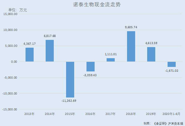 2013-2019年以及2020年1-6月,诺泰生物经营活动产生的现金流量净额分别为4,367.17万元、6,817.68万元、-11,262.49万元、-3,059.43万元、1,111.01万元、9,605.74万元、4,613.59万元、-1,671.02万元。