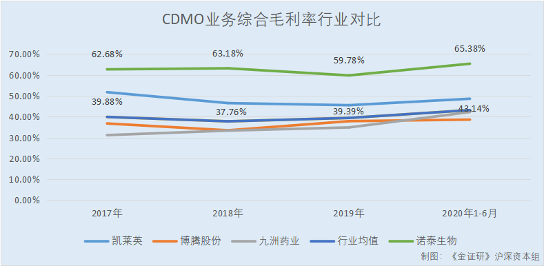2017-2019年以及2020年1-6月,诺泰生物CDMO业务综合毛利率分别为62.68%、63.18%、59.78%、65.38%。