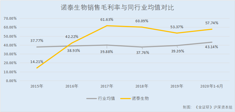 据东方财富Choice公开数据,2015-2019年以及2020年1-6月,诺泰生物的销售毛利率分别为14.21%、42.22%、61.63%、60.09%、53.37%、57.74%。