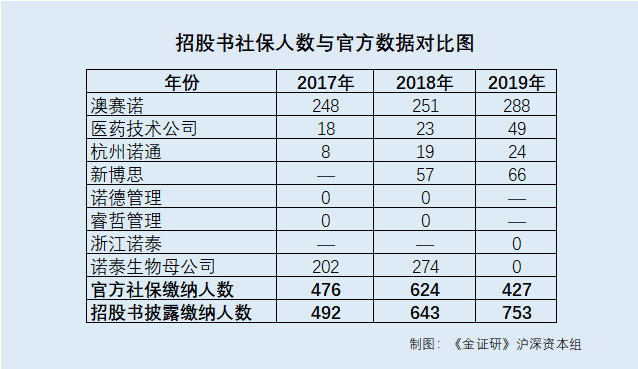 《金证研》沪深资本组研究发现,2019年,诺泰生物母公司社保缴纳人数降至0人,且招股书披露的数据与“官宣”存“出入”。