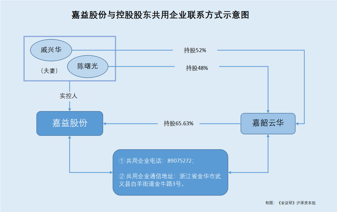 据招股书,浙江嘉韶云华投资管理有限公司(以下简称“嘉韶云华”)持有嘉益股份65.63%的股份,是嘉益股份的控股股东。而嘉韶云华由嘉益股份实控人戚兴华、陈曙光控制,其中戚兴华持股52%,陈曙光持股48%,二者为夫妻关系。