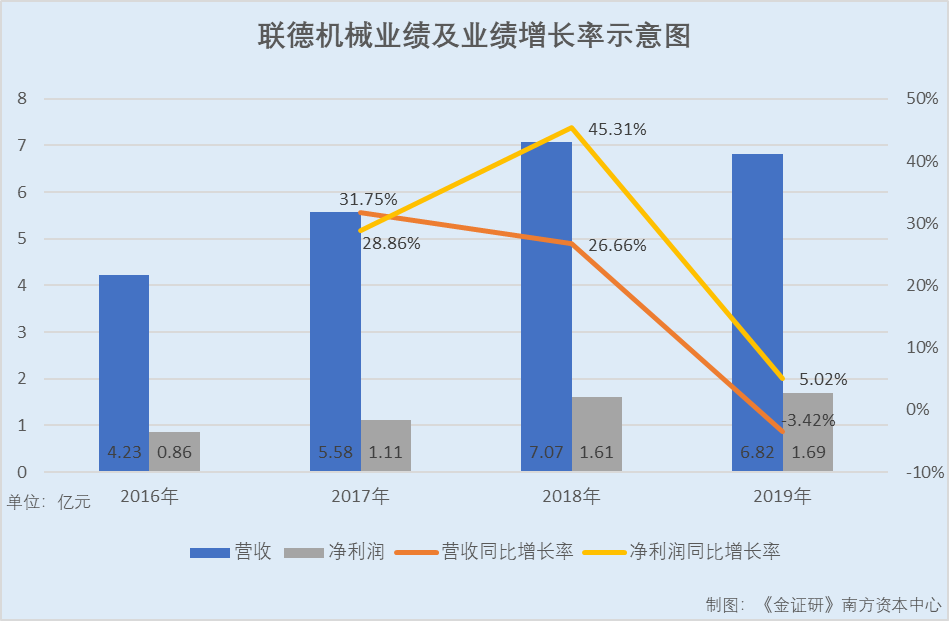 2016-2019年,联德机械的净利润分别为0.86亿元、1.11亿元、1.61亿元、1.69亿元;2017-2019年,净利润同比增长率分别为28.86%、45.31%、5.02%。