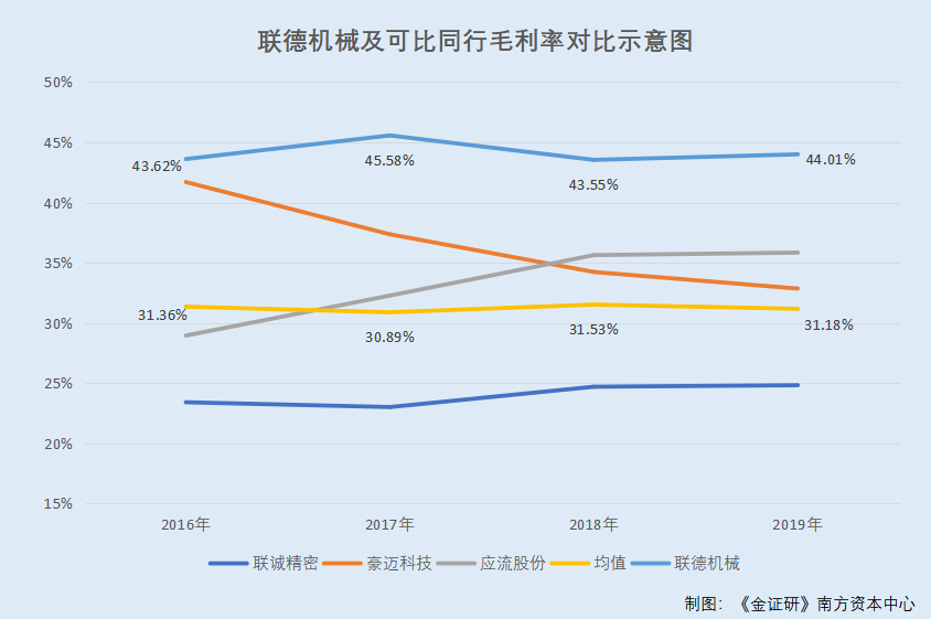 而2016-2019年,联德机械的毛利率却分别为43.62%、45.58%、43.55%、44.01%,远高于同行均值。