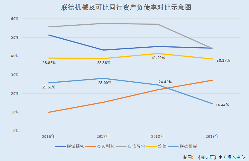 而2016-2019年,联德机械的资产负债率仅分别为25.61%、28%、24.49%、14.44%,远低于同行均值。