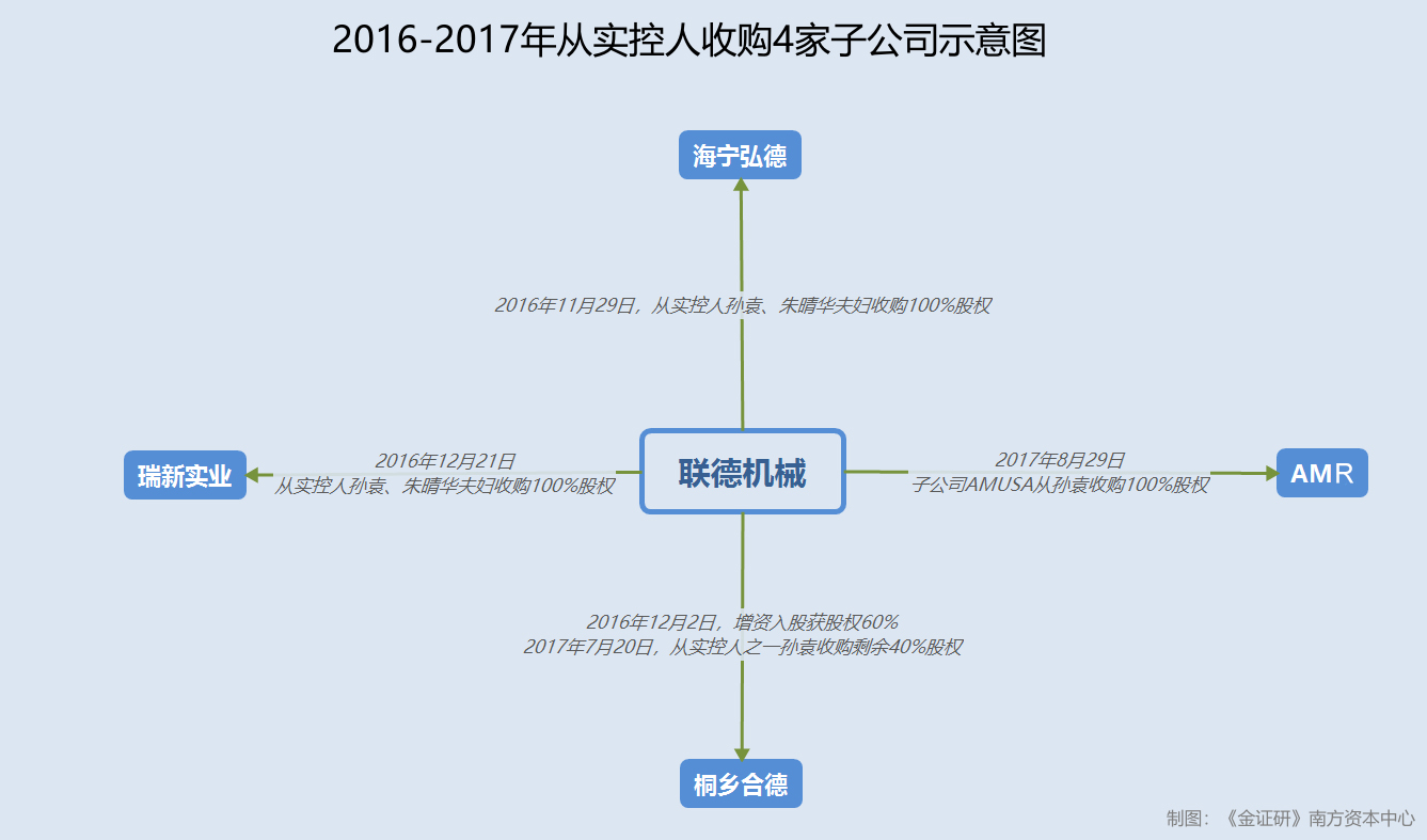 2016-2017年,联德机械先后收购了其实控人孙袁、朱晴华夫妇控制的四家公司,分别为海宁弘德机械有限公司(以下简称“海宁弘德”)、桐乡合德机械有限公司(以下简称“桐乡合德”)、瑞新实业亚洲有限公司(以下简称“瑞新实业”)、Allied Machinery Richland, LLC(以下简称“AMR”)。