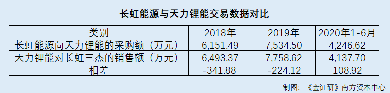 即通过上述数据对比,2018-2019年,长虹能源向天力锂能的采购额比天力锂能披露的销售额少了341.88万元、224.12万元,2020年1-6月则是多了108.92万元。而且在合并范围内之下,长虹三杰作为长虹能源子公司,为何长虹能源与天力锂能之间的交易额,比子公司长虹三杰与天力锂能的交易额还少?令人不解。