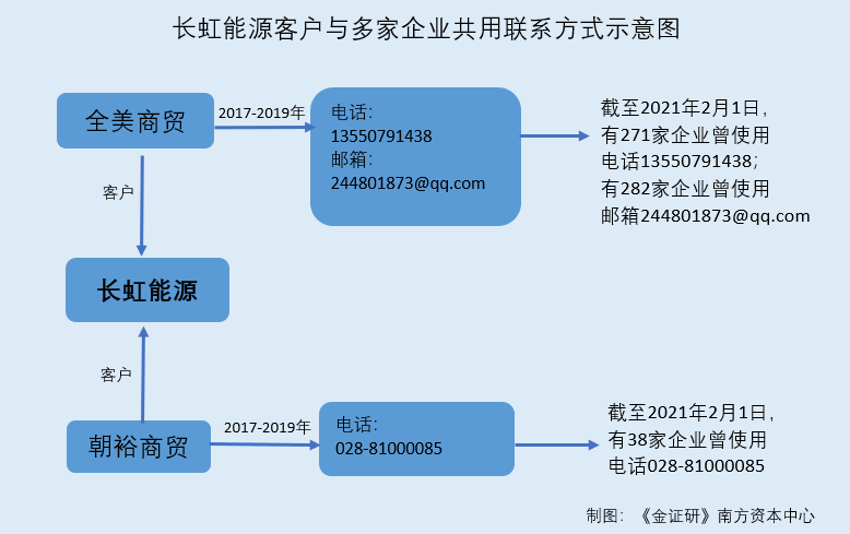 有关长虹能源与其客户之间的故事尚未讲完。经《金证研》南方资本中心研究发现,长虹能源客户实控人控制的其他公司的联系电话与长虹能源营销中心电话或“重合”,长虹能源与客户之间的关系“扑朔迷离”。