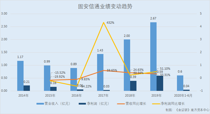 据东方财富Choice数据,2014-2019年,固安信通营业收入分别为1.17亿元、0.99亿元、0.89亿元、1.43亿元、2亿元、2.67亿元,2015-2019年,营业收入分别同比增长-15.52%、-9.65%、59.65%、40.34%、33.31%。