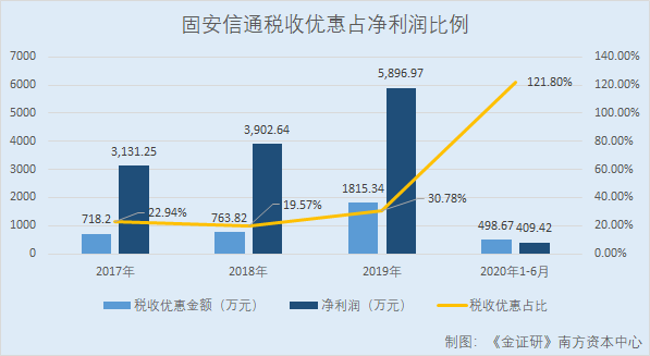 值得一提的是,2019年,固安信通税收优惠占净利润比重超三成,2020年上半年占比超120%。