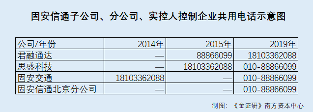 据市场监督管理局公开信息,2015年,固安信通实控人控制的君融通达,企业联系电话为88866099;2019年,君融通达企业联系电话为18103362088。