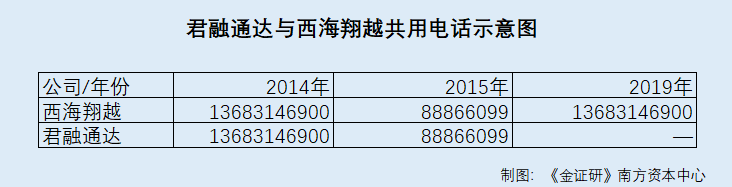 而君融通达曾于2014年使用13683146900作为其联系电话。2015年,君融通达与西海翔越联系方式一致,均系88866099。
