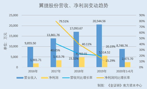 2016-2019年和2020年1-6月,翼捷股份的净利润分别为1,901.71万元、3,413.76万元、4,783.01万元、5,514.52万元、2,473.7万元,2017-2019年净利润分别同比增长79.51%、40.11%、15.29%。