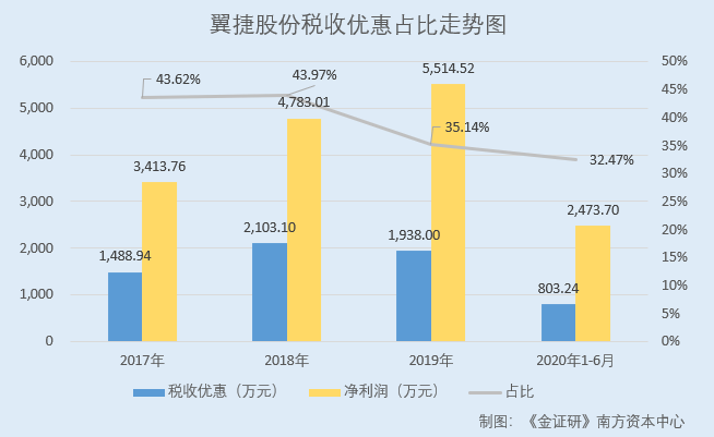 据招股书,2017-2019年和2020年1-6月,翼捷股份的税收优惠金额分别为1,488.94万元、2,103.1万元、1,938万元、803.24万元,占当期净利润的比例分别为43.62%、43.97%、35.14%、32.47%。