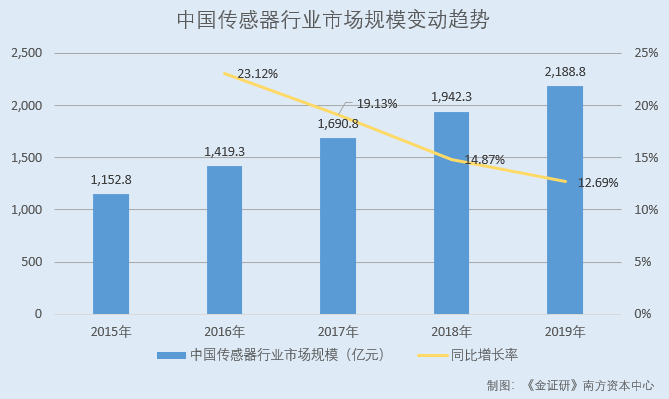 据前瞻产业研究院公开信息,2015-2019年,中国传感器行业市场规模分别为1,152.8亿元、1,419.3亿元、1,690.8亿元、1,942.3亿元、2,188.8亿元,2016-2019年分别同比增长23.12%、19.13%、14.87%、12.69%。
