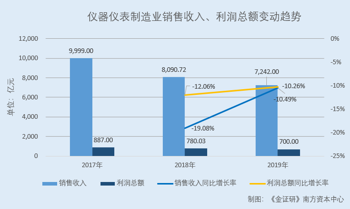 据国家统计局数据,2017-2019年,中国仪器仪表制造业年度销售收入分别为9,999亿元、8,090.72亿元、7,242亿元,2018-2019年,仪器仪表制造业销售收入分别同比增长-19.08%、-10.49%。