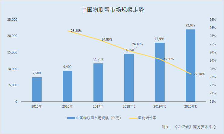 据招股书援引自赛迪研究报告数据,2015-2017年,中国物联网市场规模分别为7,500亿元、9,400亿元、11,731亿元;2016-2017年,分别同比增长25.33%、24.80%。预计2018-2020年,中国物联网市场规模分别为14,558亿元、17,994亿元、22,079亿元;同期,分别同比增长24.1%、23.6%、22.7%。
